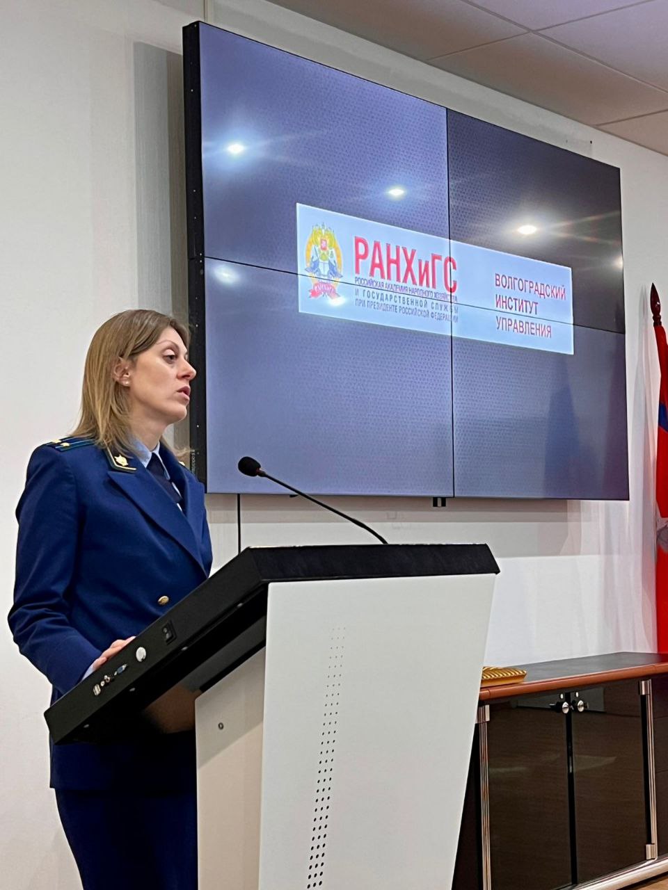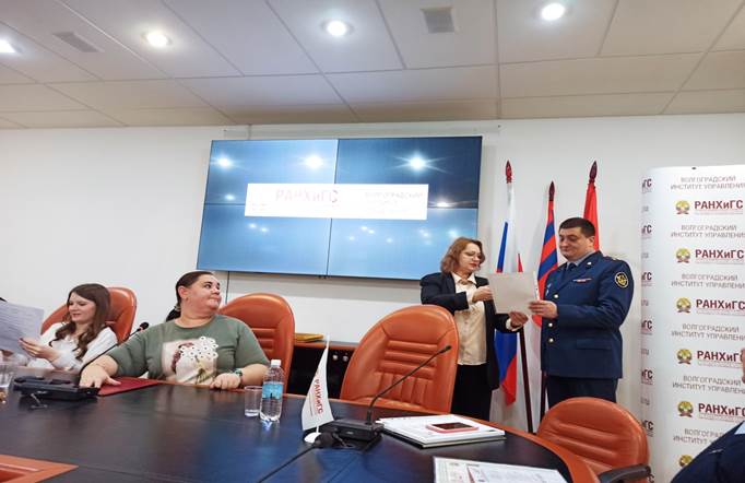 С приветственным словом выступили кандидат юридических наук, доцент кафедры теории права и государственно-правовых дисциплин Волгоградского института управления Э.В.Голоманчук и начальник отдела государственной службы и кадров комитета образования и науки Волгоградской области Л.В.Малахова.